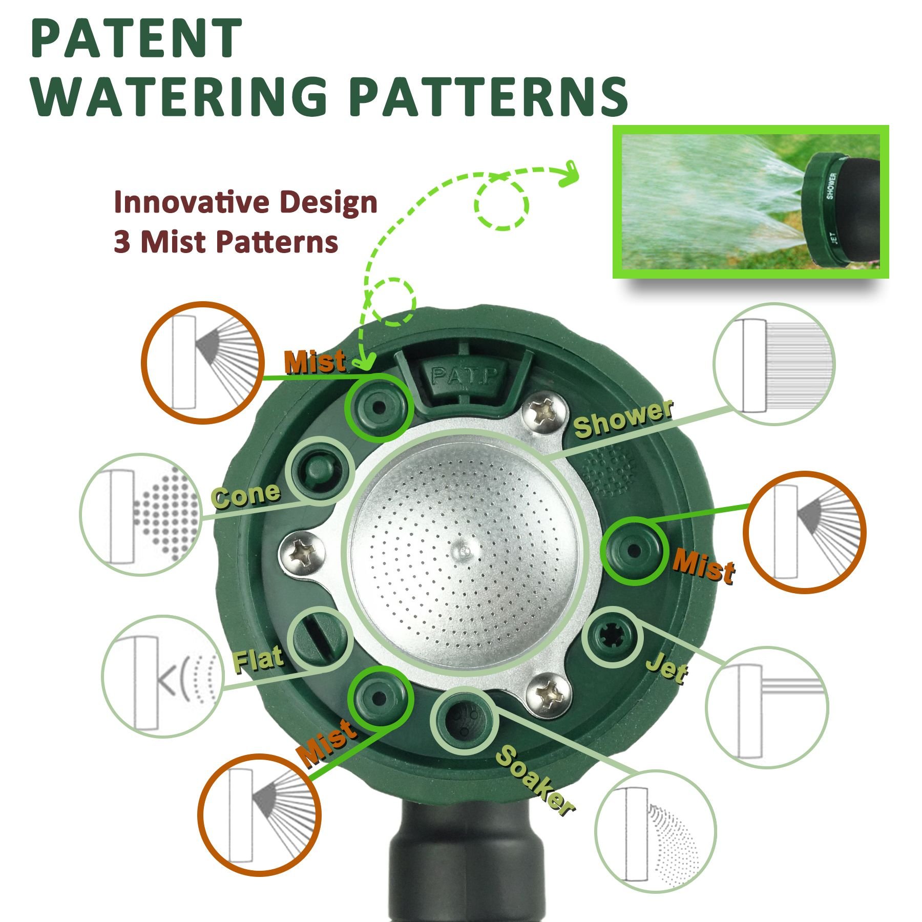 Adjustable Spray Patterns: FLORIAX Watering Wand is adjustable and has six different watering patterns. Choose from a cone, flat, jet, soaker, shower and mist patterns for your watering duties.