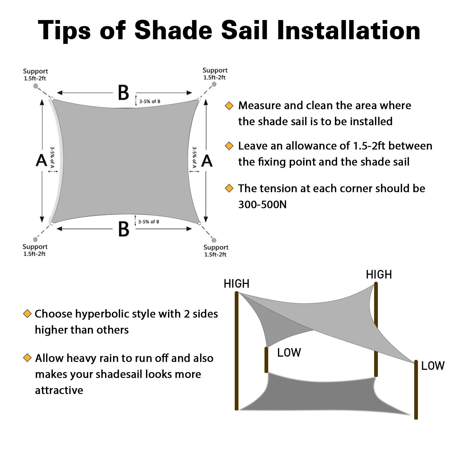 4.Measurment & Warranty: Measurement is taken from D ring to D ring,leave 1.5 - 2 foot space for the hardware kit between shade sail D ring and mounting points,all edges are finished slightly curved so it can be stretched tightly.