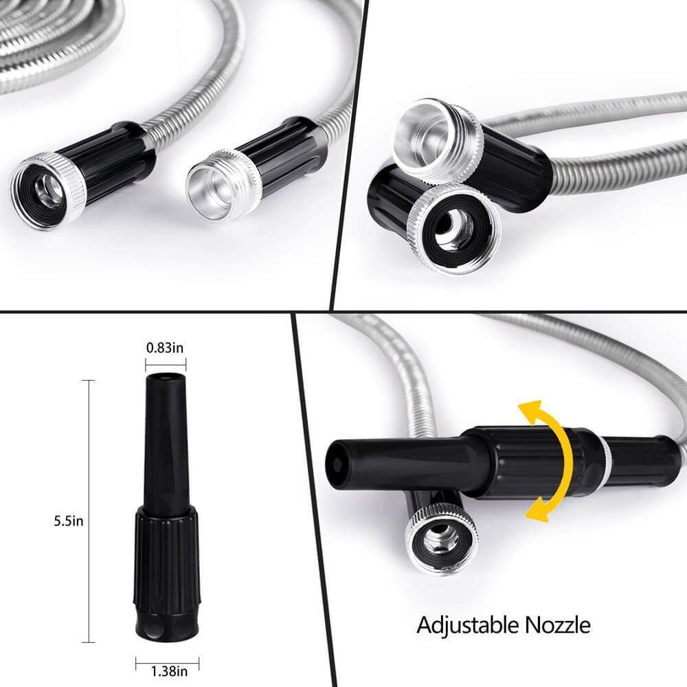 Made of 304 stainless steel, no corrosion, no rust, super light, no kink, also resistant to extreme weather conditions. Install 3 rubber gaskets in the water pipe, waterproof and leak-proof. Small size, light weight, easy operation, adjustable flow, more suitable for all ages. Suitable for kids, teens, kids, adults, women, men, young, old and more. The garden hose can be used normally in summer, even in the Summer sun, it will not get hot. Cool hose gives you a better experience.