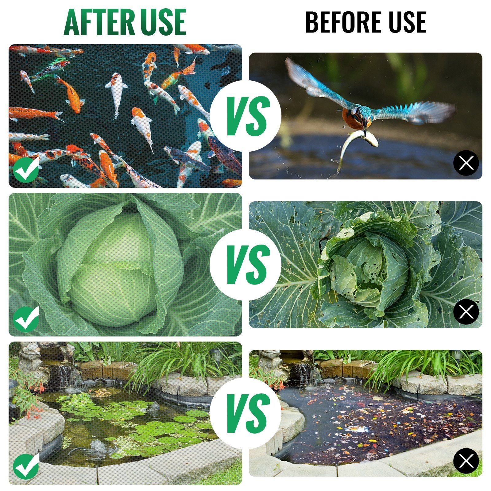 2.GARDEN POND PROTECTOR- With 1/2 inch meshes that allow the area it covers to be viewed easily, this pond netting cover can effectively protect your planted area or fishpond from fallen leaves, other debris, and predators.