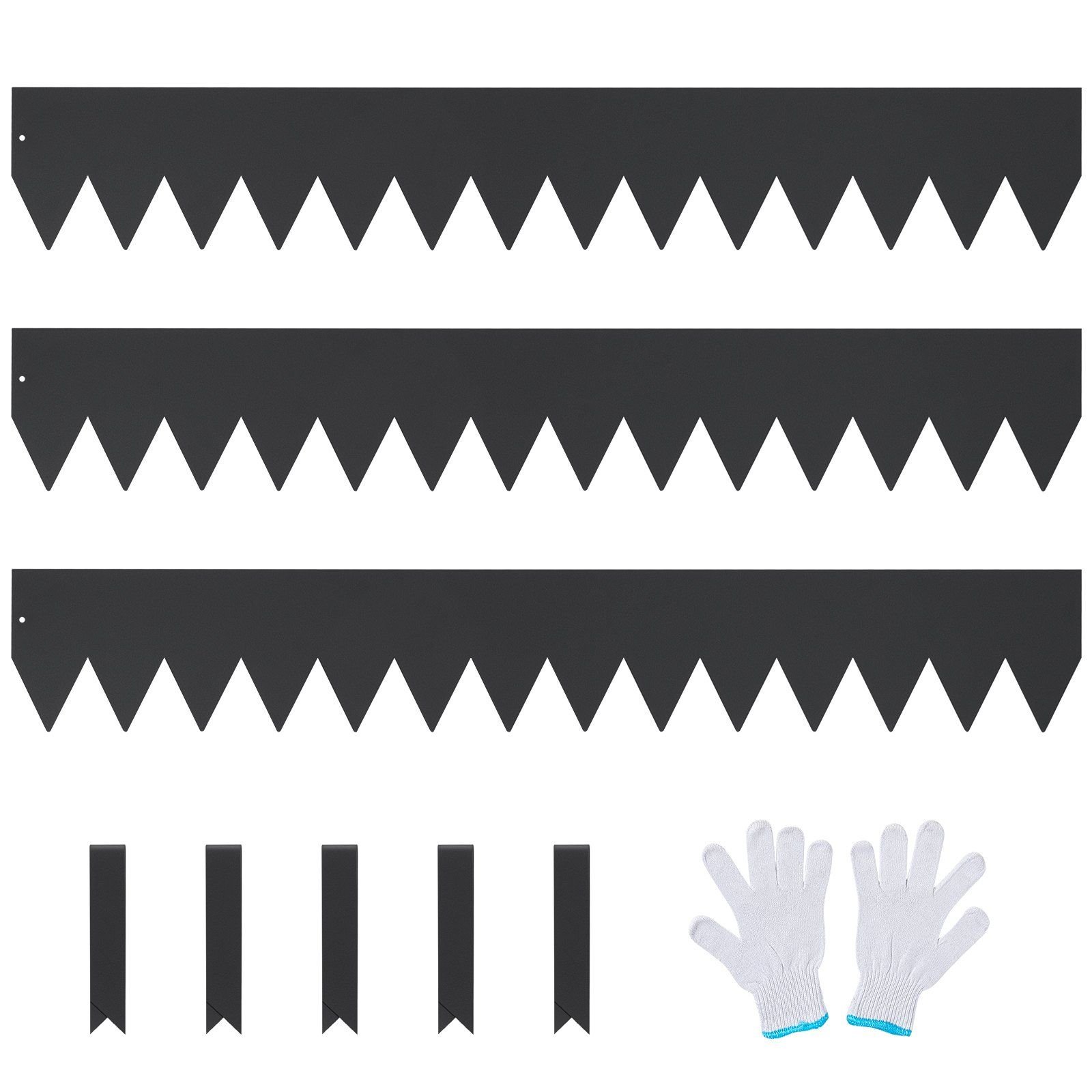 Highlights: 1.Various Sizes: VEVOR steel landscape edging is available in a set of 3 pieces, each measuring 40x6 inch. It comes with 5 clips for effortless installation. The extended spikes make secure ground anchoring, allowing you to create clean lines and spaces in your lawn. Loved by gardening enthusiasts. 2.Rust and Corrosion Resistant: Crafted from 0.07" thick galvanized steel with a powder-coated surface, our rust-proof landscape edging is built to withstand outdoor elements. It is not easy to fade, or crack, ensuring long-lasting durability. 3.Flexible and Easy to Bend: With its bendable and flexible design, you can easily shape this steel garden edging border to fit your garden, whether it's square, circular, or any complex shape. It won't break or damage during bending. 4.Simple Installation: Installing our landscape lawn edging is a breeze. Connect the sections with the fixing clips, and you'll have it set up in just minutes. We also include installation gloves for added safety. 5.Wide Applications: Our hammer-in edging border is ideal for outdoor gardens, pathways, lawns, plantations, courtyards, and more. It helps prevent weed growth while enhancing the neat and beautiful appearance of your garden.