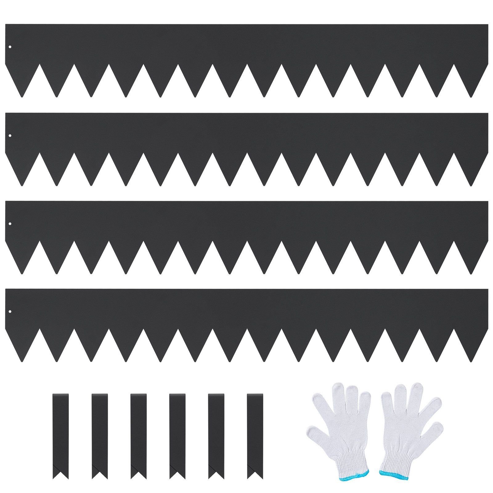 Highlights: 1.Various Sizes: VEVOR steel landscape edging is available in a set of 4 pieces, each measuring 40x6 inch. It comes with 6 clips for effortless installation. The extended spikes make secure ground anchoring, allowing you to create clean lines and spaces in your lawn. Loved by gardening enthusiasts. 2.Rust and Corrosion Resistant: Crafted from 0.07" thick galvanized steel with a powder-coated surface, our rust-proof landscape edging is built to withstand outdoor elements. It is not easy to fade, or crack, ensuring long-lasting durability. 3.Flexible and Easy to Bend: With its bendable and flexible design, you can easily shape this steel garden edging border to fit your garden, whether it's square, circular, or any complex shape. It won't break or damage during bending. 4.Simple Installation: Installing our landscape lawn edging is a breeze. Connect the sections with the fixing clips, and you'll have it set up in just minutes. We also include installation gloves for added safety. 5.Wide Applications: Our hammer-in edging border is ideal for outdoor gardens, pathways, lawns, plantations, courtyards, and more. It helps prevent weed growth while enhancing the neat and beautiful appearance of your garden.